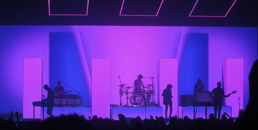 In addition to their new musical style, the band’s stage setup has changed. From dark, gloomy lighting to vibrant pinks, blues, and greens, complete with multi-colored neon rectangles to represent the band’s original trademark, their overall style has completely changed to imitate an 80s-90s aesthetic.